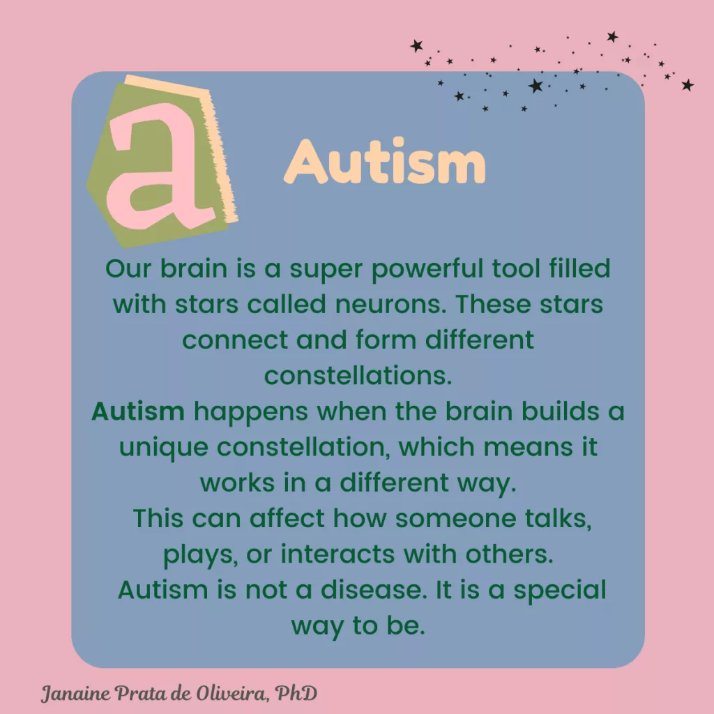 Autism happens when the brain builds a unique constellation, which means it works in a different way. This can affect how someone talks, plays, or interacts with others.
