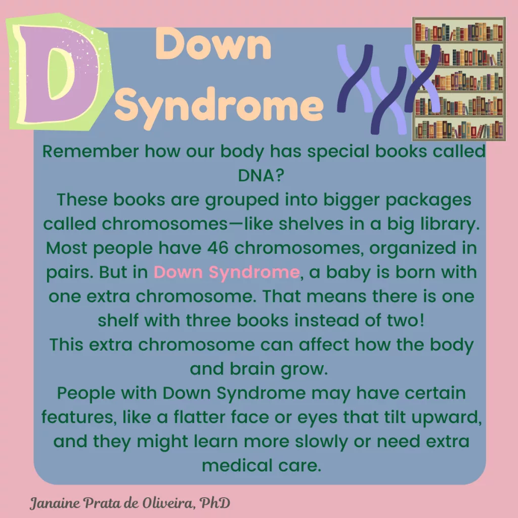 People with Down Syndrome may have certain features, like a flatter face or eyes that tilt upward, and they might learn more slowly or need extra medical care.