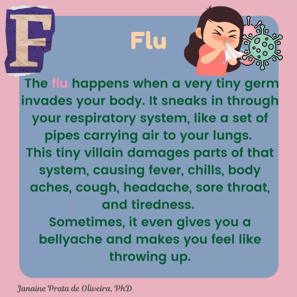 The flu happens when a very tiny germ invades your body. It sneaks in through your respiratory system, like a set of pipes carrying air to your lungs.