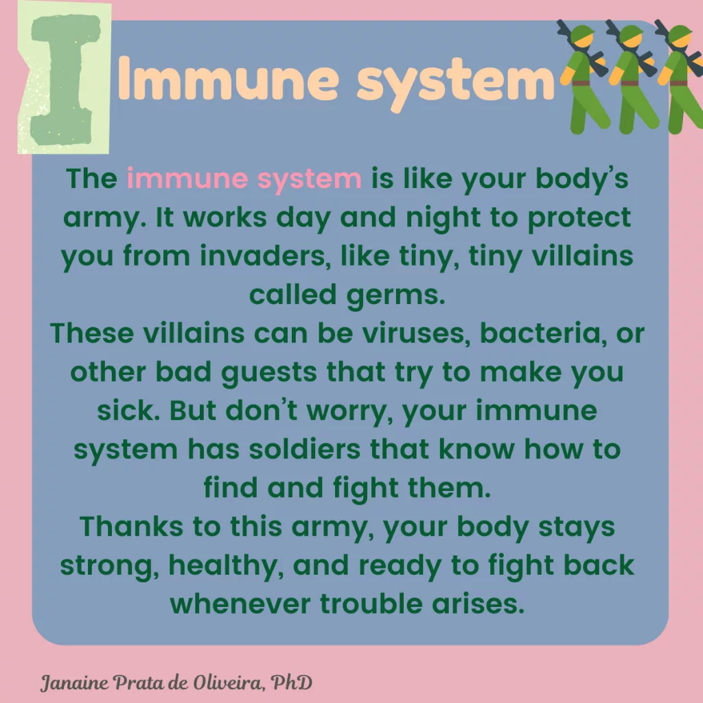 The immune system is like your body’s army. It works day and night to protect you from invaders, like tiny, tiny villains called germs.