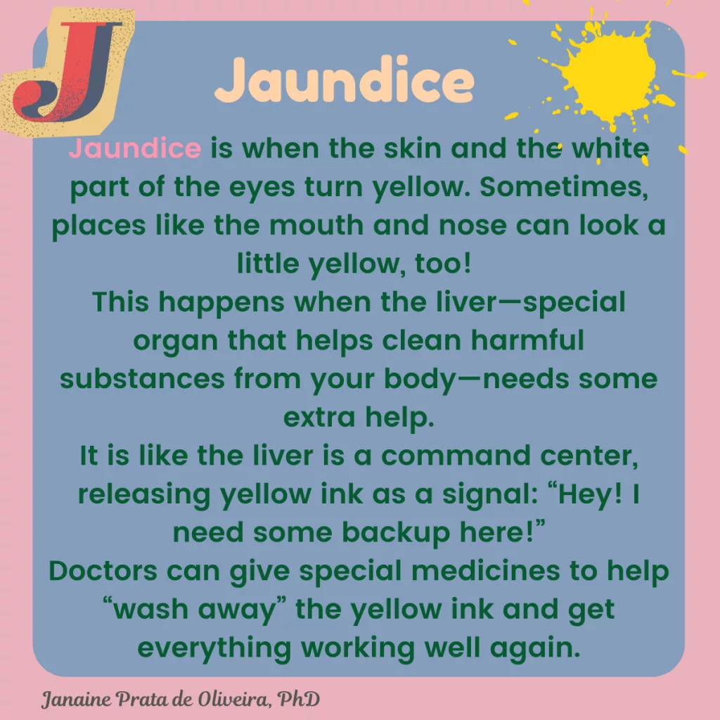 Jaundice is when the skin and the white part of the eyes turn yellow. Sometimes, places like the mouth and nose can look a little yellow, too!