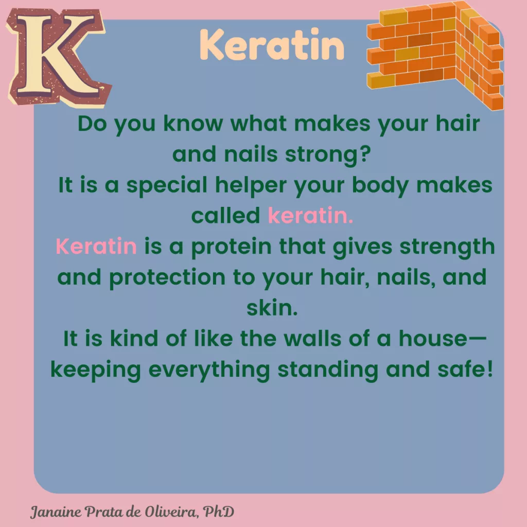 Keratin is a protein that gives strength and protection to your hair, nails, and skin. It is kind of like the walls of a house—keeping everything standing and safe!