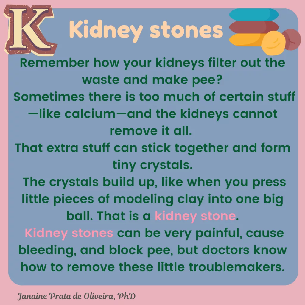 Sometimes there is too much of certain stuff—like calcium—and the kidneys cannot remove it all. That extra stuff can stick together and form tiny crystals.
