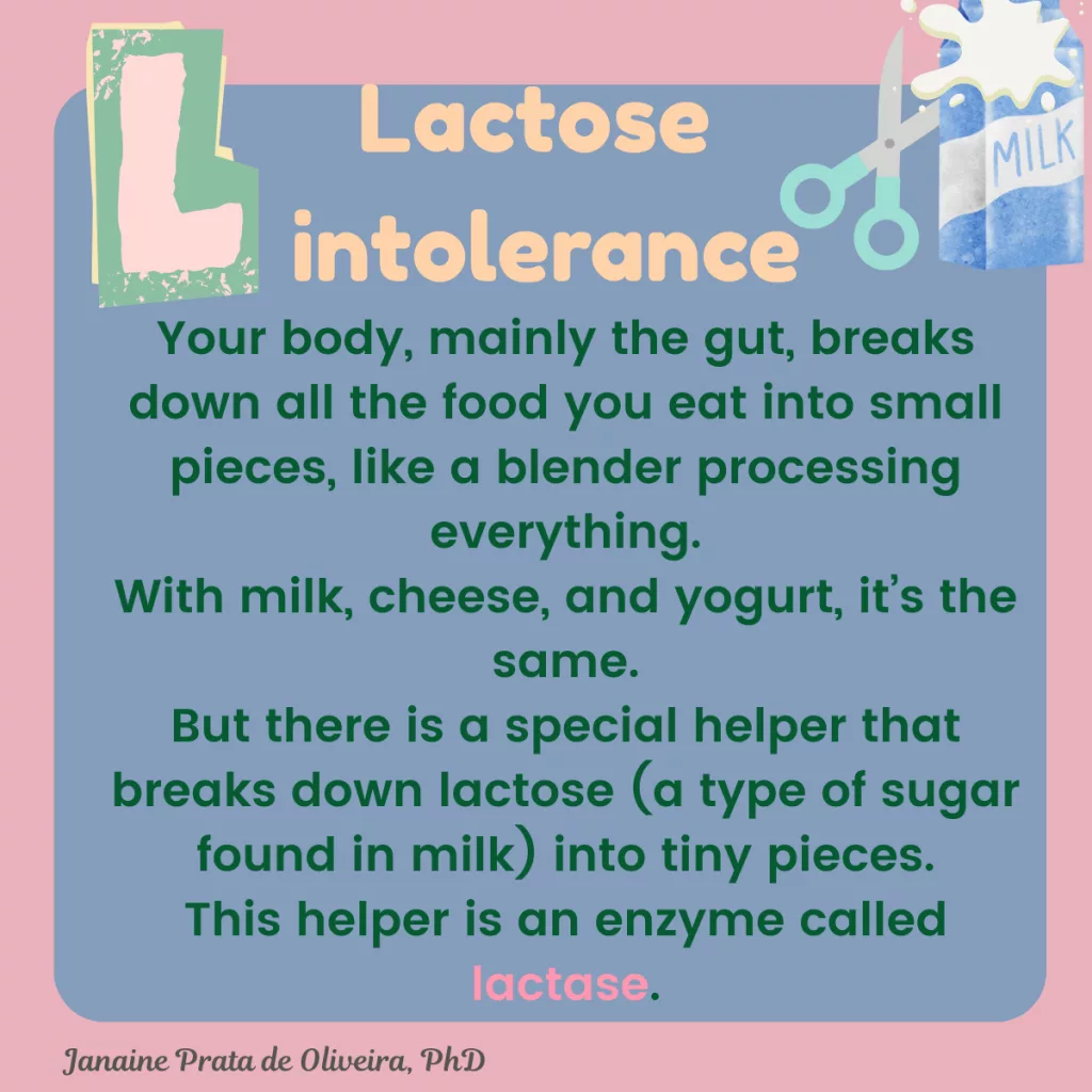 But there is a special helper that breaks down lactose (a type of sugar found in milk) into tiny pieces. This helper is an enzyme called lactase.