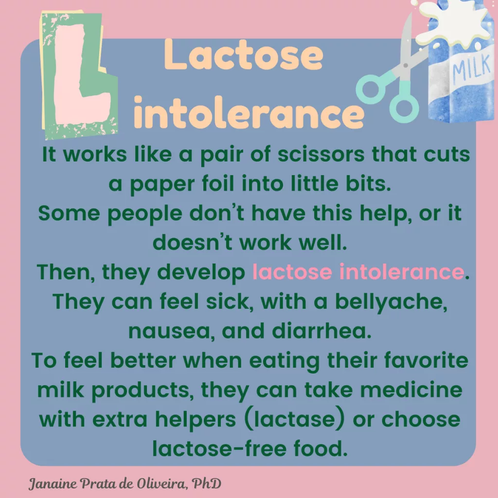 It works like a pair of scissors that cuts a paper foil into little bits. Some people don’t have this help, or it doesn’t work well. Then, they develop lactose intolerance. They can feel sick, with a bellyache, nausea, and diarrhea.