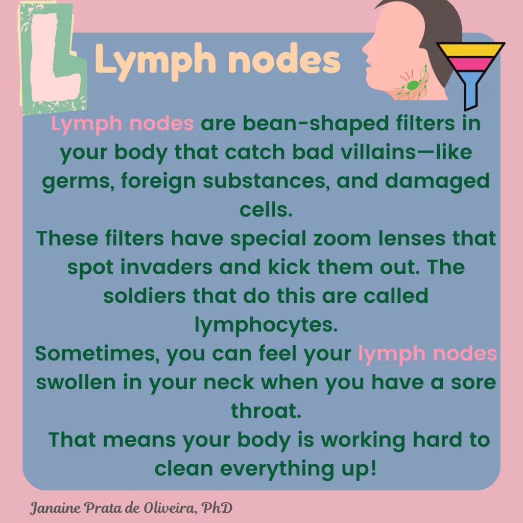 Lymph nodes are bean-shaped filters in your body that catch bad villains—like germs, foreign substances, and damaged cells. These filters have special zoom lenses that spot invaders and kick them out. The soldiers that do this are called lymphocytes.