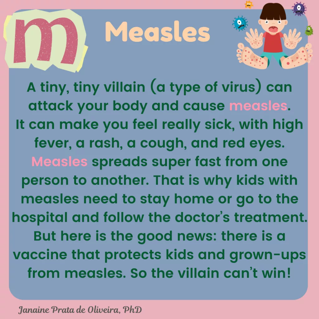 But here is the good news: there is a vaccine that protects kids and grown-ups from measles. So the villain can’t win!