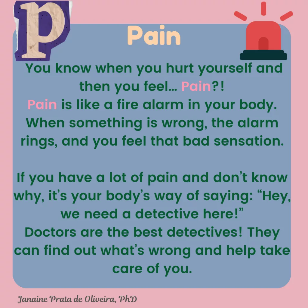 Pain is like a fire alarm in your body. When something is wrong, the alarm rings, and you feel that bad sensation.