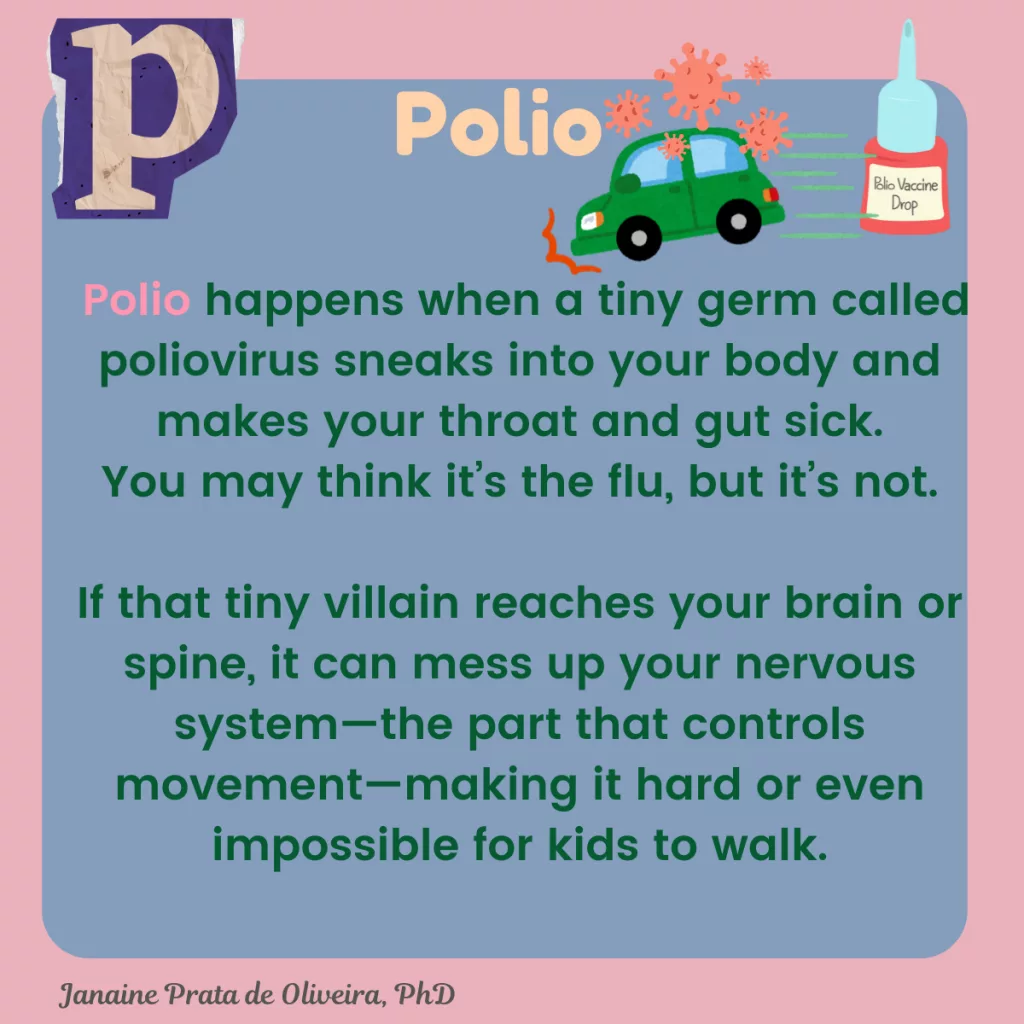 Polio happens when a tiny germ called poliovirus sneaks into your body and makes your throat and gut sick.