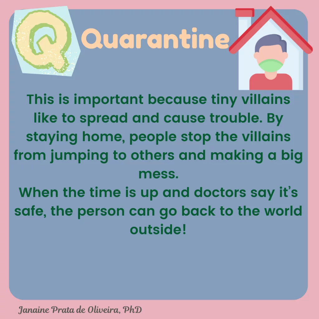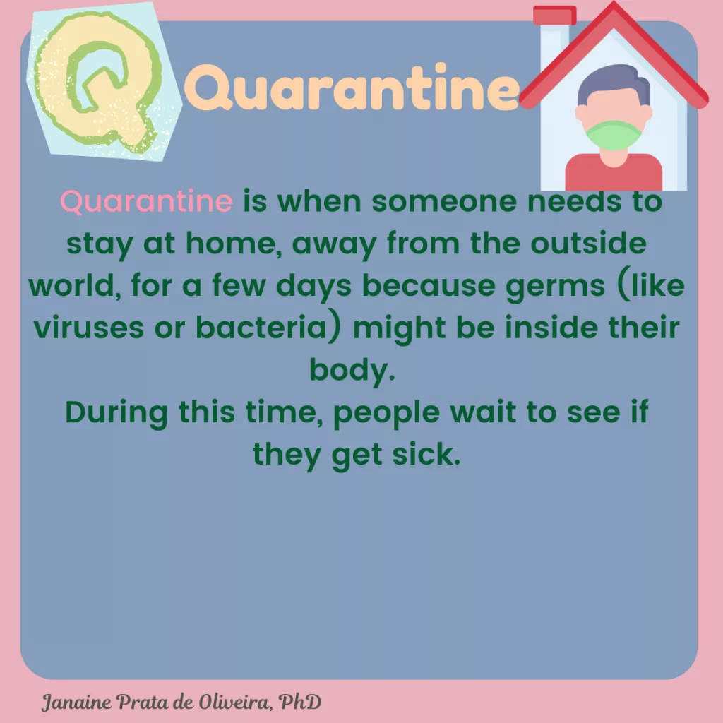 Quarantine is when someone needs to stay at home, away from the outside world, for a few days because germs (like viruses or bacteria) might be inside their body.