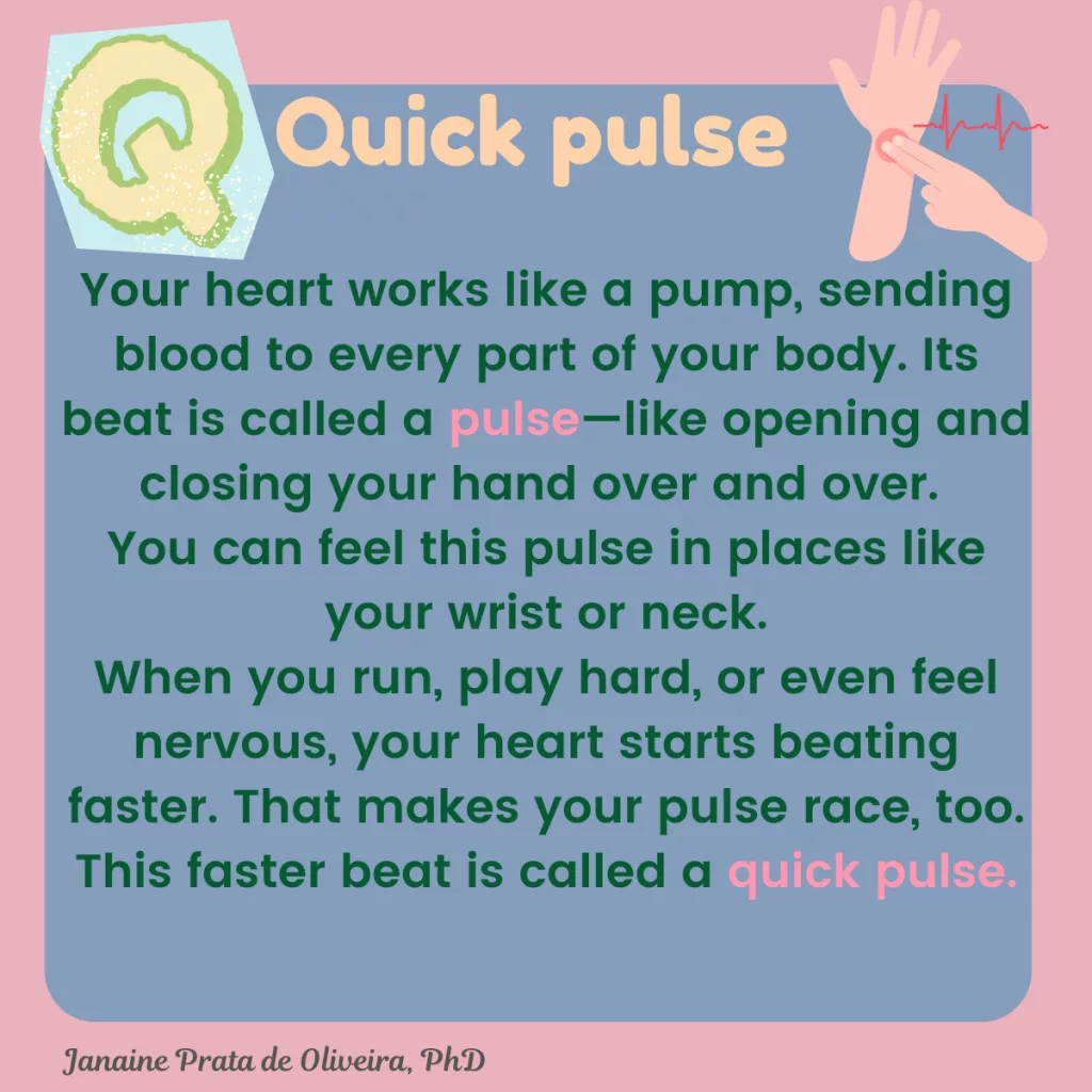 When you run, play hard, or even feel nervous, your heart starts beating faster. That makes your pulse race, too. This faster beat is called a quick pulse.