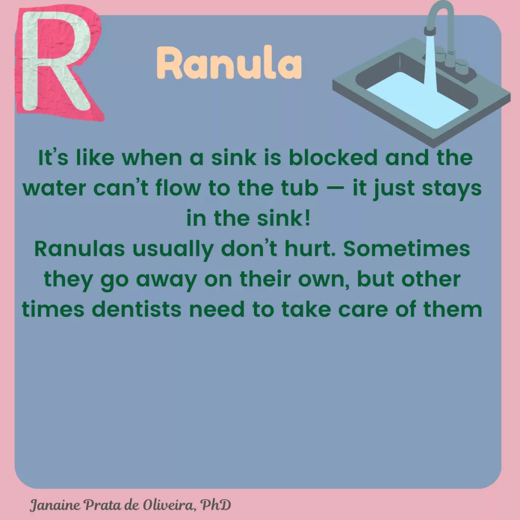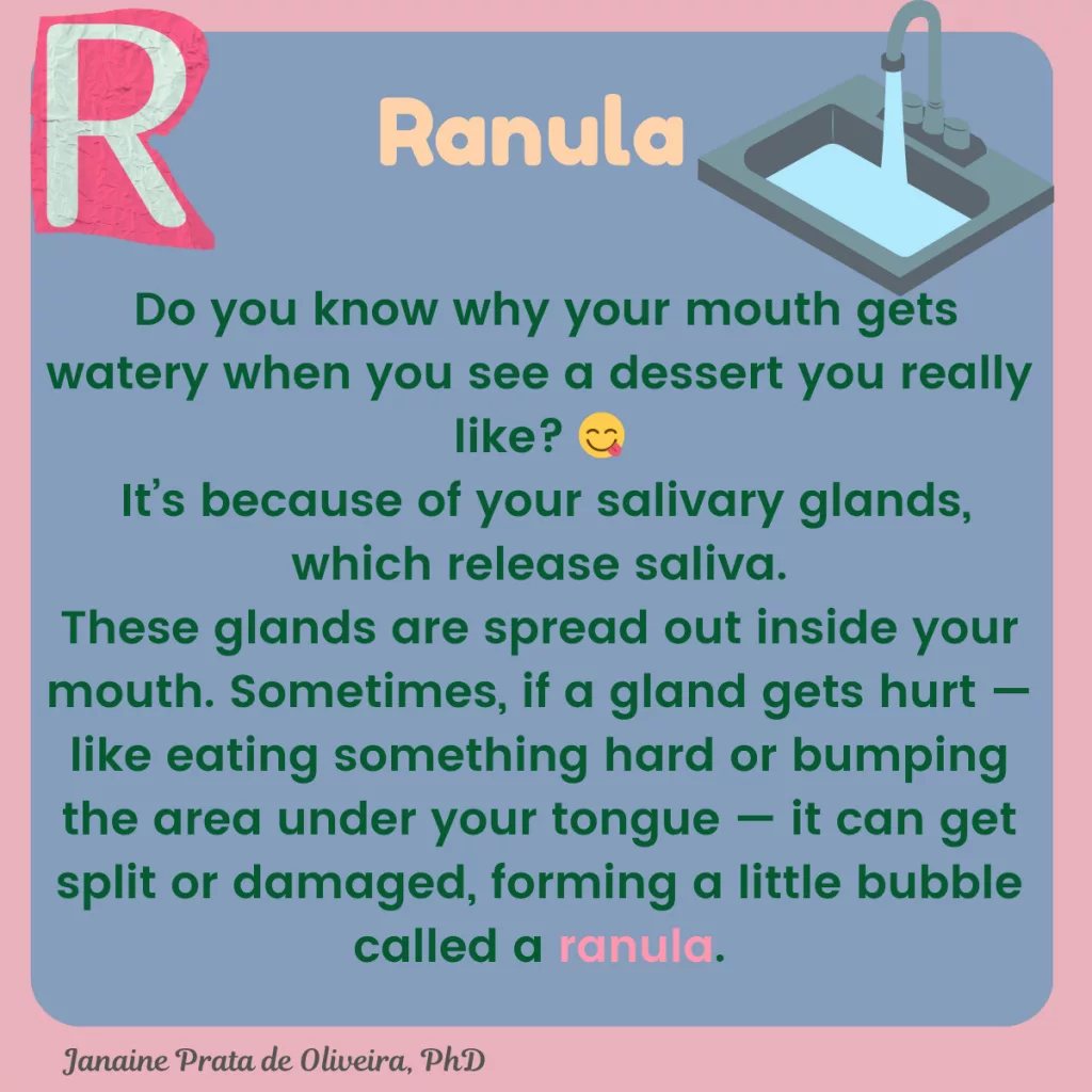 These glands are spread out inside your mouth. Sometimes, if a gland gets hurt — like eating something hard or bumping the area under your tongue — it can get split or damaged, forming a little bubble called a ranula.